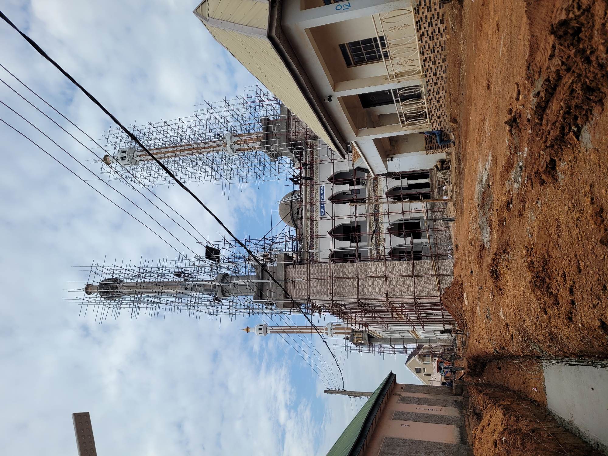 construction site in Alizaga, Nigeria, featuring a mosque under construction with extensive scaffolding around the minarets and the main building