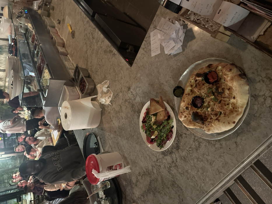 An overhead shot shows food preparation and service in a restaurant. A long counter with various ingredients lines one side. Two plates rest on the counter; one with a flatbread pizza with toppings, the other with a salad and toast. A roll of paper towels and other service items are also visible. Receipts are stacked near a metal countertop. People are visible on the left side of the image.