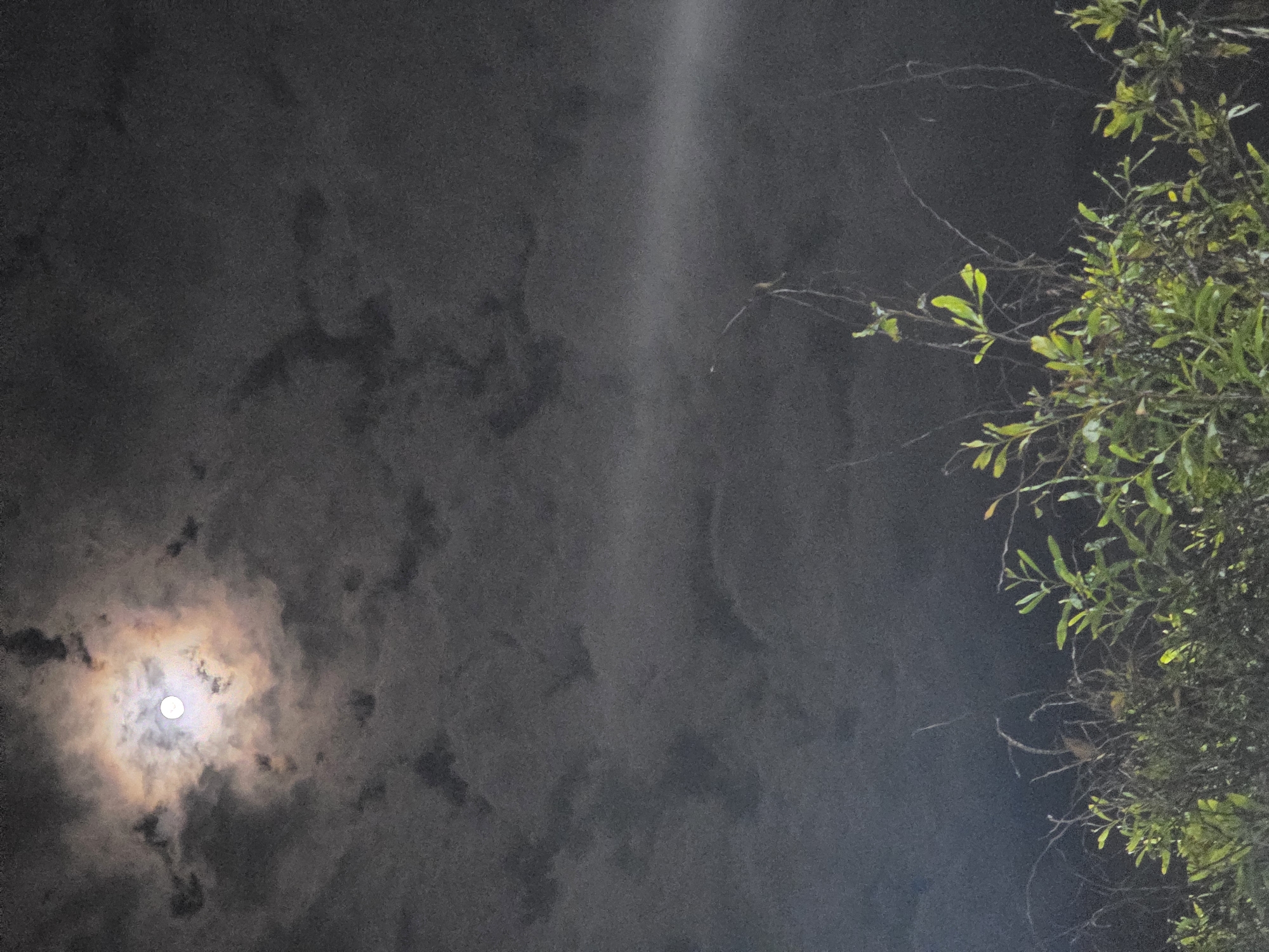 The image, likely taken at night, shows a moon obscured by clouds in the lower left quadrant