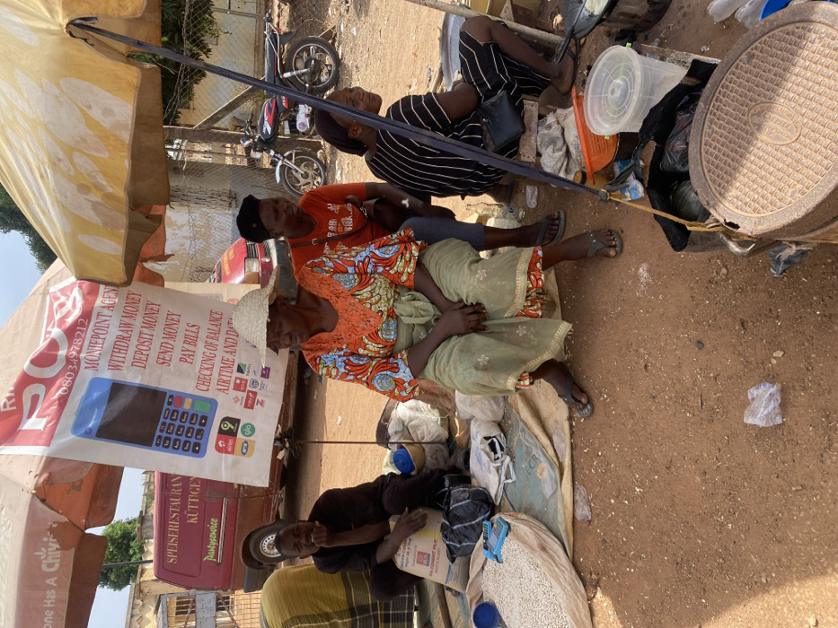 This image captures an outdoor market scene in Kakuri Gwari, Nigeria, under a bright sky. The foreground features reddish-brown dirt ground with scattered plastic debris. Four individuals are seated under the shade of two large, worn market umbrellas; one red and white, the other yellow and white. On the left, a man wearing dark clothing sits on a low platform or bag, resting his chin on his right hand. Beside him, an open sack filled with white beans or grains is visible, along with a blue scoop and a small electronic device, possibly a scale or payment terminal. To his right, a woman with a straw hat wears a vibrant orange, red, and blue patterned top over a light green skirt, with black sandals on her feet. She is seated, hands clasped in front of her. Next to her, a woman in an orange t-shirt and dark pants is seated. Partially visible on the far right, another woman in a black and white striped garment is seated near a metal container with a patterned lid and clear plastic containers, suggesting a food stall setup. A prominent banner, partially obscured by the umbrellas, hangs vertically, advertising "MONIEPOINT AGENT" services, including withdrawing, depositing, and sending money, paying bills, checking balance, airtime, and data, along with various network and payment logos. In the background, a red van with "SPEISERESTAURANT KÜTTIGEN Partyservice" written on its side is parked. Further back, a red car and a black motorcycle are visible, alongside a corrugated fence and what appears to be a building structure, indicating a commercial area.