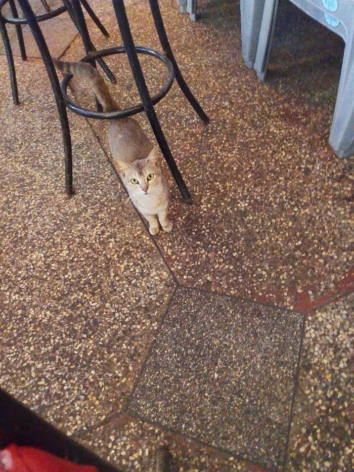 The image displays an indoor scene located in Nairobi, Kenya. A light-colored domestic cat, appearing tan or fawn with faint tabby markings, stands on a terrazzo floor, looking directly towards the camera. The cat possesses yellow-green eyes and is positioned between the dark metal legs of a bar stool, with its body partially beneath the stool's circular footrest. The floor consists of various shades of brown and white aggregate embedded in a matrix, featuring dark reddish-brown grout lines that form geometric patterns, including a distinct darker square tile in the lower right quadrant. In the upper right background, the lower sections of grey plastic chairs are visible. No human subjects are present.