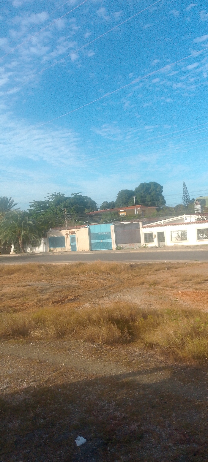 This image presents a static landscape scene in Santa Ana, Venezuela. The upper third of the frame consists of a bright blue sky dotted with scattered white cirrocumulus clouds. Multiple thin, parallel utility lines traverse the sky diagonally from upper left to lower right. The foreground depicts an undeveloped, arid parcel of land, largely covered with dry, discolored brown and yellowish grass, interspersed with patches of exposed dirt and small stones. A small, crumpled piece of white debris, possibly paper or plastic, is visible on the dark ground in the lower center. A paved asphalt road, appearing to be two lanes wide, horizontally bisects the midground, separating the dry land from a line of buildings. In the background, a series of structures stand behind the road, backed by dense green foliage. On the far left, several large palm trees and other green trees partially obscure a building with a light-colored facade and some blue-painted sections. Adjacent to it, a single-story building with a beige facade features a prominent blue metal gate and a smaller blue door. Above its perimeter wall, a section of wire fence topped with what appears to be barbed wire is visible, along with utility poles and lines. Further to the right, a white single-story building with multiple windows, some fitted with horizontal security bars, and a brown roofline is present. Behind these structures and elevated slightly, additional residential-style buildings with terracotta-colored roofs and light-colored walls are discernible, nestled among abundant green trees. The far right of the background features a tall, slender coniferous tree next to a building with a distinct peaked roof. No human figures, vehicles, or dynamic interactions are visible within the scene.