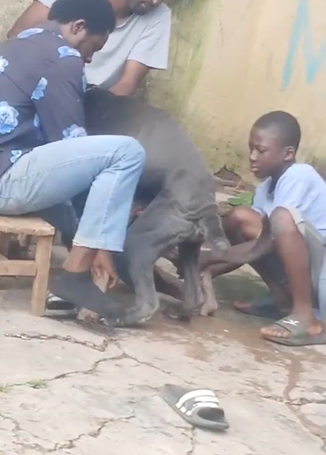 Three people are present outdoors, assisting a grey dog. The dog is being held while one person sits on a small, wooden stool, possibly examining the dog's hind legs. A pair of sandals and an Adidas sneaker lay on the ground nearby. There is a wall visible with graffiti on it.