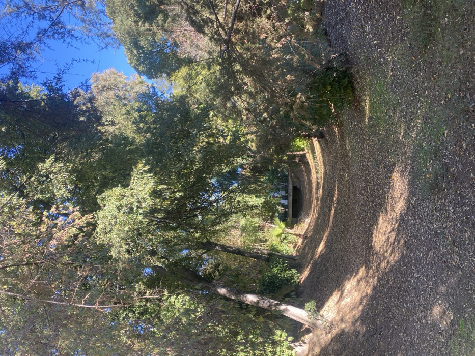 The scene depicts a dry gully or drainage channel in Mechouar Fes Jdid, Morocco, viewed longitudinally from a slightly elevated position. The ground of the channel and its sloped banks are heavily covered with a dense layer of dry, brown and orange fallen leaves, interspersed with patches of exposed soil and sparse green vegetation. Numerous mature trees with green foliage line both sides of the channel, forming a dense canopy overhead through which patches of clear blue sky are visible, particularly in the upper right. Sunlight penetrates the canopy, casting distinct shadows across the leaf-covered ground. In the background, a low, concrete or stone bridge with railings spans the width of the channel, appearing to be the termination point of the visible gully. Dense green foliage is visible beyond the bridge. A single, small palm-like plant is visible on the left bank in the midground. No individuals, animals, or explicit actions are present in the image. The environment suggests an outdoor area, possibly a park or natural preserve, under sunny conditions.