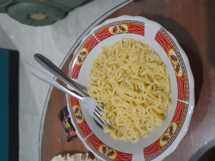 The scene depicts an indoor setting, likely a domestic kitchen or living area, in Gelam, Indonesia. A white, scalloped-edge ceramic bowl, adorned with a red and gold decorative pattern, occupies the center foreground. It contains a serving of yellow instant noodles suspended in a light broth. A silver-colored metal fork and spoon are crossed and resting within the noodles. To the left of the bowl, on a wooden surface, a small black and red packet is visible. The background is blurred, showing a green upholstered furniture item on the right and a dark teal surface towards the top left. The surface under the bowl appears to be a polished wooden table. No individuals are present.