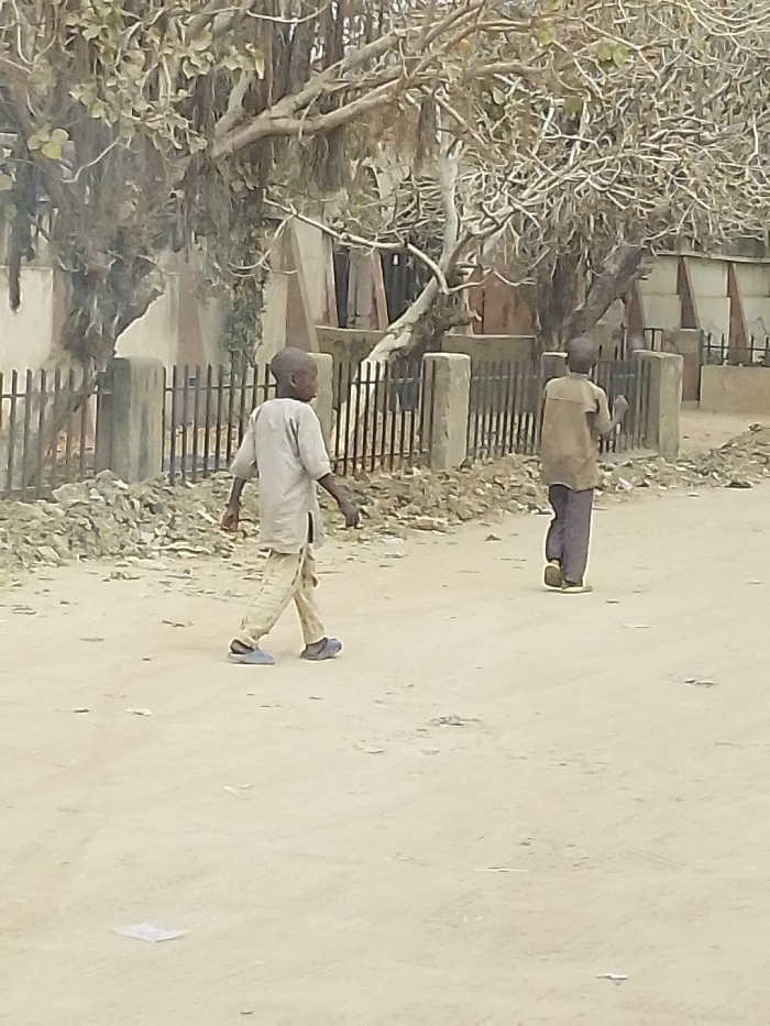 The image displays an outdoor scene in Hotoro South, Nigeria. Two young males are walking on an unpaved dirt road. The foreground subject, positioned left of center, is a young male wearing a light-colored short-sleeved tunic, light-colored patterned trousers, and blue slip-on footwear. He walks from left to right, his head turned slightly to his right. A second young male is positioned further down the road, walking in the same direction, with his back mostly to the viewer. He wears a brownish-tan long-sleeved top, dark trousers, and light-colored open-back sandals. The road surface is light brown dirt with minor scattered debris. In the mid-ground, a dark metal fence with concrete posts runs parallel to the road. Behind the fence, several trees with mostly bare branches and some hanging root structures are visible. Distant light-colored building structures are partially obscured by the trees and fence. The scene is illuminated by natural daylight, suggesting a dry or dusty environment.