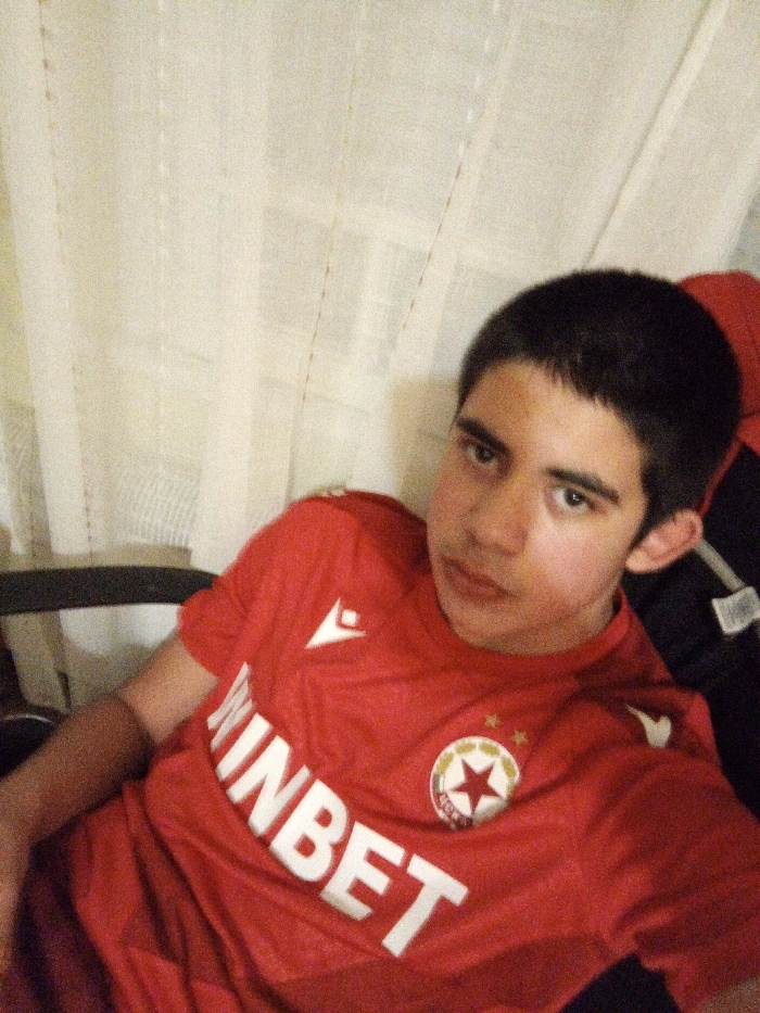 An indoor portrait taken in the city of Tsalapitsa, Bulgaria, shows a young male subject seated. The individual, an adolescent with short, dark hair and dark eyebrows, looks directly at the camera with a neutral expression. He is wearing a red short-sleeved t-shirt. The front of the shirt displays the white capitalized text "WINBET" across the chest. To the upper right side of the text, a circular emblem featuring a red five-pointed star within a white and green motif, topped by two small gold stars, is visible. A small white V-shaped logo is present on the left shoulder area of the shirt. The background consists of a light-colored, vertically patterned curtain to the left and a dark object, possibly the back of a chair, to the right.