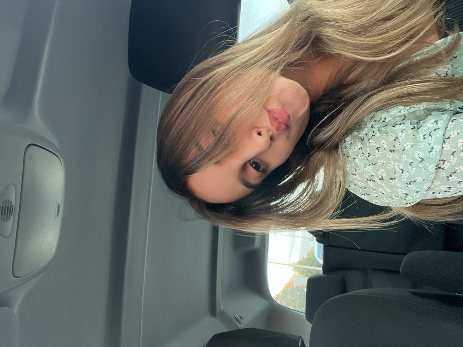 A female individual is depicted from the upper torso, seated within the front passenger side of a vehicle. She has long, light brown hair with blonde highlights, which partially obscures the left side of her face. Her right eye is clearly visible. She is making a puckered facial expression with her lips. She wears a light green blouse adorned with a small white floral pattern. The car's interior includes a gray headliner with an overhead console, and dark fabric headrests and seatbacks are visible in both the foreground and background. Through the rear window, an outdoor environment features green foliage, a light blue sky, and indistinct distant structures or poles. No identifiable landmarks or signage are present in the image to confirm a specific location within Porto, Portugal.