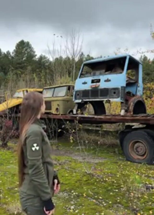 A woman with long, straight, brown hair wearing a green jacket and pants with a radiation symbol on the sleeve stands outdoors in an overgrown area. Behind her are derelict vehicles, including truck cabs on a trailer. The ground is covered in moss and fallen leaves. The sky is overcast. She looks directly at the camera, then turns away again, walking towards the right.