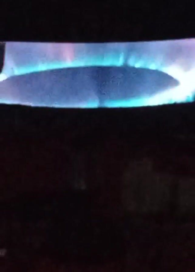 horizontal rectangular area with a colorful plasma-like formation. The edges of the rectangle glow with a blue hue that transitions to a violet interior. In the middle of the shape, an orange glow briefly appears then disappears. The background is black.