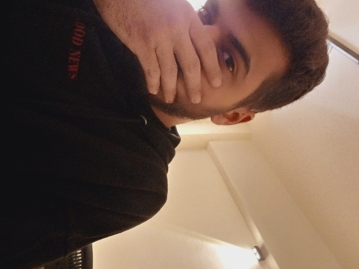 The image depicts an indoor scene within Al-Midan Municipality, Syria. The primary subject is an adult male, viewed from the chest up, positioned slightly to the left of the frame. He has dark hair and stubble. His left hand is raised to cover the lower portion of his face, including his mouth and nose, while his right eye is visible and directed towards the viewer. The subject is wearing a black hooded sweatshirt, featuring red text on the chest, partially legible as "OOD NEWS". The background consists of a plain, light-colored wall and ceiling. Artificial illumination is provided by two visible recessed spotlights on the ceiling and one wall-mounted spotlight. A dark, indistinct object, consistent with a chair back, is partially visible along the far right edge of the frame.
