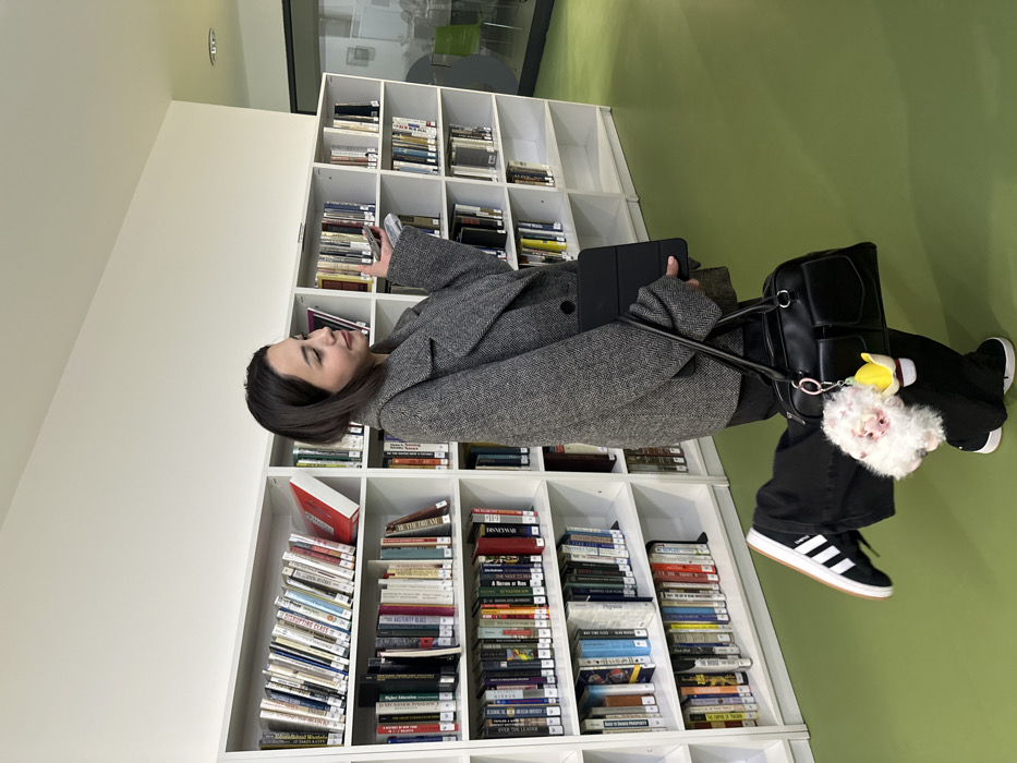 A young adult female is depicted standing in a modern library environment in Yerevan, Armenia