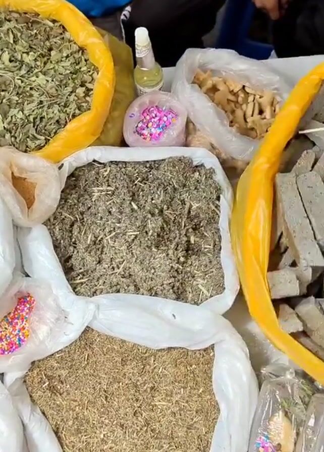 person sitting behind a table filled with bags of various dried herbs and ingredients, likely at a market. There are at least six large bags containing different dried plants and herbs, including what appears to be sage and ginger. Two small bags contain multicolored sprinkles. In the right of the frame, there is a yellow bag with grey rectangular blocks. A terracotta plate with a metal frame on top is placed on top of this yellow bag. A smoldering grey block rests inside the metal frame, emitting smoke.