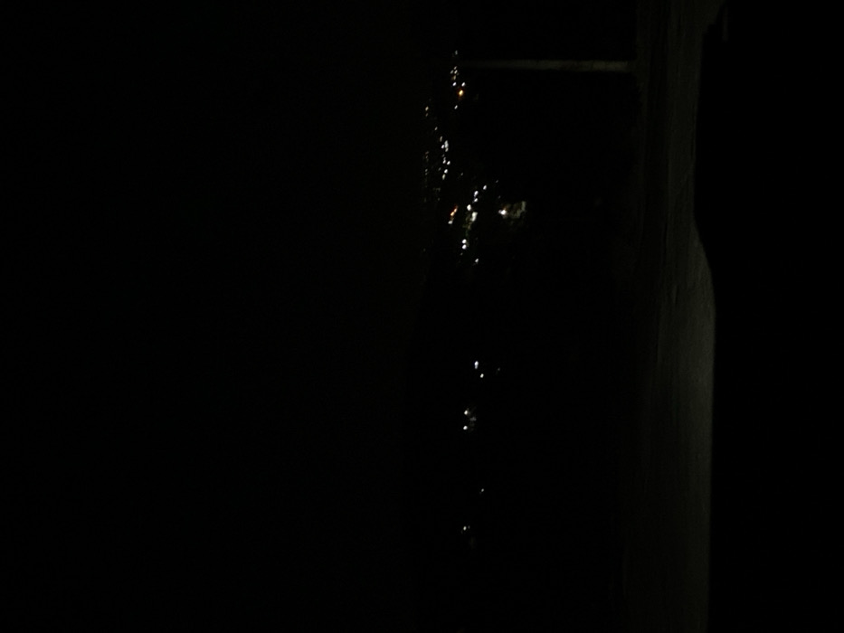 The image displays a nighttime panoramic view of the city of At-Tall, Syria, from an elevated perspective. The upper half of the frame is dark, representing the night sky. In the mid-to-far background, a multitude of blurred, diffuse point sources of artificial light, predominantly white and yellow, delineate the urban spread of At-Tall across undulating topography. A dark, vertical pole-like structure is present on the far right side of the frame. The foreground consists of a dark, indistinct ground surface, with a faint horizontal strip of illumination near the bottom. No individuals or specific activities are discernible within the frame.