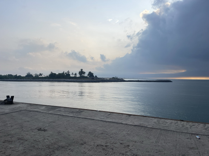 The image depicts a calm ocean scene with a cloudy sky. A long, low island covered in trees and foliage stretches across the center of the frame. A concrete pier occupies the foreground, its surface plain and lightly textured. The water is still, reflecting the sky and island. A breakwater extends into the ocean, protecting the harbor entrance. The sky is dominated by a large, dark cloud on the right, while lighter clouds and a hint of sunlight can be seen on the left.