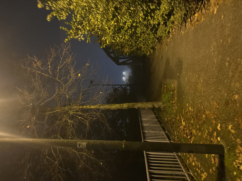 The image displays an outdoor scene at night in Strasbourg, France, characterized by foggy or misty conditions under artificial illumination. In the foreground on the left, a dark utility pole stands, featuring a white rectangular marker with a faint numeral "3" or "B" on its surface. Adjacent to this pole, a white metal railing with vertical balusters runs horizontally, suggesting a bridge or elevated walkway over water. The ground is a paved surface, likely asphalt, scattered with yellow and orange autumn leaves, particularly on the left side where a strip of green grass or moss is visible. A tall, slender deciduous tree with bare branches, retaining a few yellow leaves, is positioned centrally. Further down the path, another bare tree is present. On the right, a dense hedge of green-yellow foliage lines the pathway. The path extends into the distance, obscured by fog, with the diffused glow of at least two additional streetlights visible. In the far background on the right, the dark structural components of a metal bridge are faintly discernible through the mist. No individuals or animals are present.