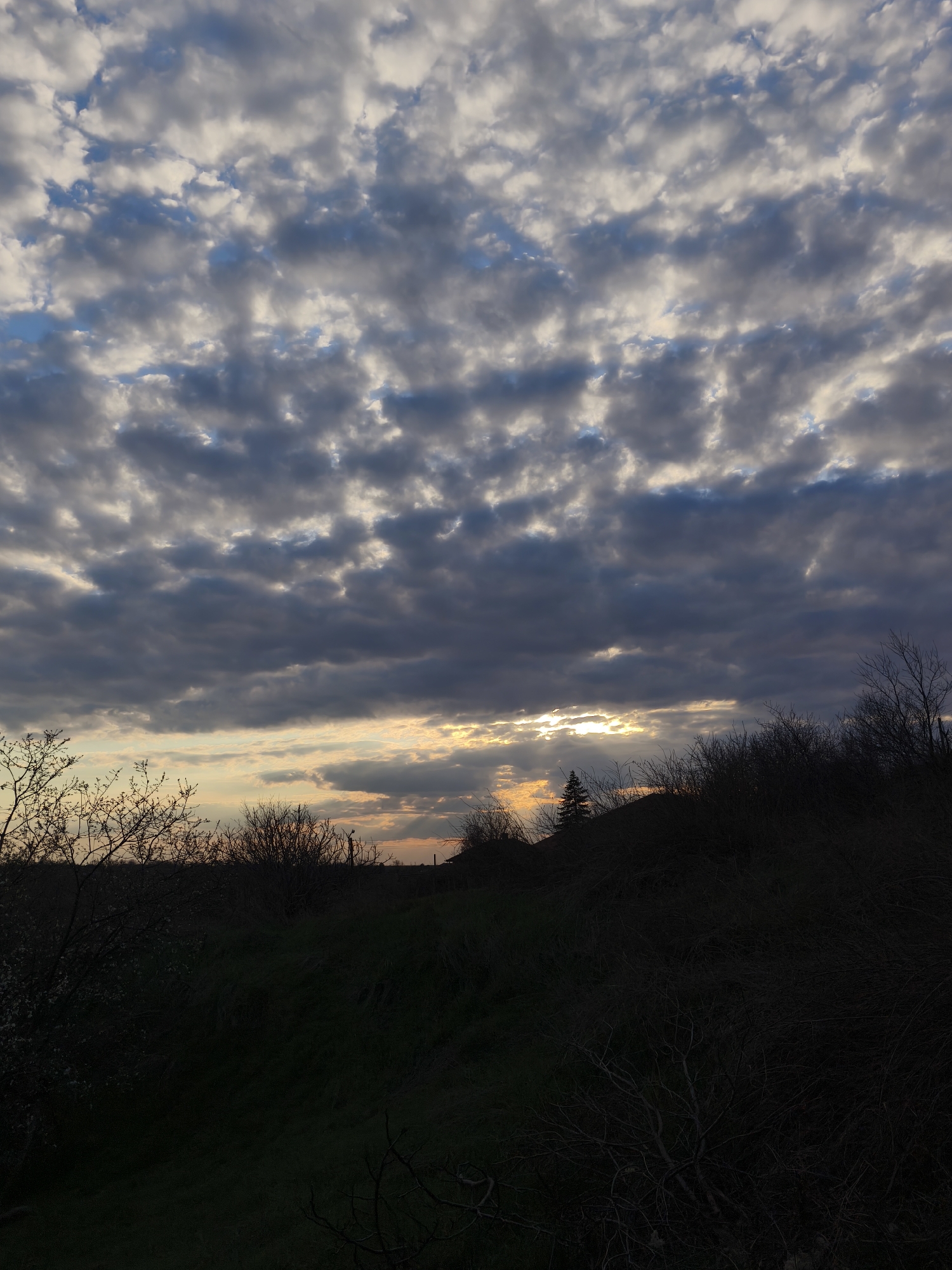 The image displays an outdoor landscape in Slavyanovo, Bulgaria, captured during the late afternoon or early evening, characterized by a sunset or dusk lighting condition. The upper two-thirds of the frame are filled with a dense, textured cloud cover, predominantly composed of stratocumulus clouds displaying various shades of dark grey and white, with intermittent patches of clear blue sky visible between the cloud formations. Towards the horizon, a low-setting sun emits bright yellow and orange light, illuminating the undersides of the clouds and creating distinct crepuscular rays that emanate from behind a cloud bank on the right side of the frame. The lower third of the image consists of a dark, silhouetted terrain, likely a hillside or uneven ground, cast in deep shadow. A solitary conifer tree is prominently silhouetted on a rise, positioned slightly to the left of the frame's vertical center, directly against the brightest part of the horizon. The foreground and mid-ground contain dense, dark vegetation, including numerous bare deciduous trees and bushes, with some areas of visible green ground cover, particularly on the left side. No human subjects, animals, or clearly identifiable artificial structures are present within the scene.