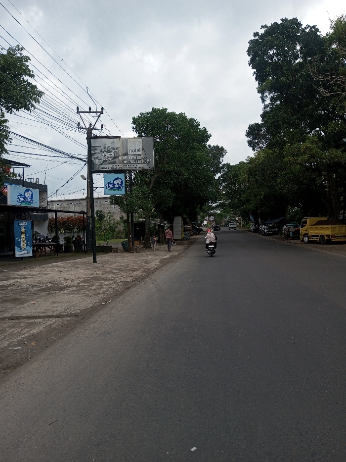This image depicts a wide, paved, two-lane road in the city of Khajuripada, India, under an overcast sky. The road extends centrally into the distance, flanked by sidewalks and dense green foliage. On the left side of the road, a dirt and concrete sidewalk parallels the thoroughfare. A prominent utility pole with numerous overhead power lines stands near the foreground. Attached to this pole is a large vertical sign structure. The upper sign advertises a "hotel" with the slogan "STAY WITH US AND FEEL LIKE HOME". Below it are two blue-and-white rectangular signs for "Laundry", each featuring a washing machine icon. Further left, partially obscured by trees, an outdoor establishment with tables and chairs is visible, potentially a cafe or eatery, next to a building with a dark roof and lighter-colored walls. A single individual walks away from the camera on the left sidewalk, dressed in light-colored clothing. The right side of the road is also lined with large, green trees. Further down the road, a yellow dump truck with an open bed containing dark material is parked. Other vehicles, including cars and motorcycles, are visible in the distance, both parked and in motion. Closer to the foreground on the road, one person rides a white scooter or motorcycle away from the camera, wearing a light-colored head covering and clothing. The scene conveys a semi-urban environment with significant greenery and overhead utility infrastructure.