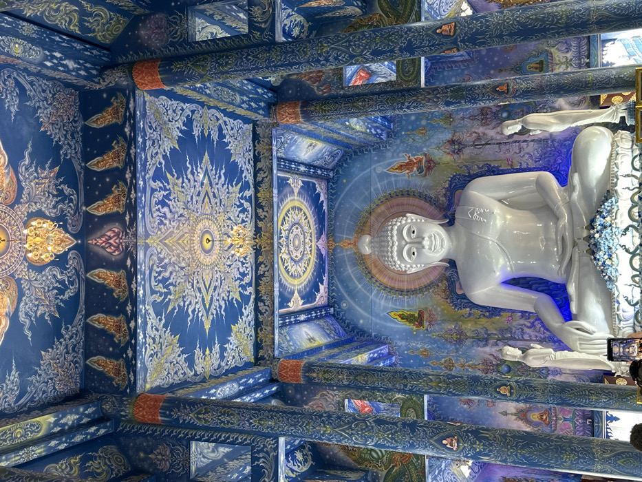 A temple's interior view features a large, white Buddha statue in a seated pose. Elaborate blue and gold murals cover the ceiling and walls, adorned with intricate patterns and celestial designs. Decorative beams intersect the space, adding depth. The scene is bathed in soft light, highlighting the artwork's detailed craftsmanship and the statue's serene presence.