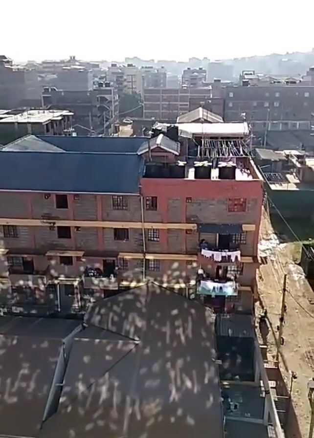 n overview of a densely populated urban area. Multiple buildings, mostly medium-rise, are visible, constructed from brick, concrete, and corrugated iron. Laundry hangs from one building’s balcony. Water tanks are positioned on the roofs. A narrow dirt road divides some of the structures. The sky is overcast and hazy. The perspective is from an elevated position, possibly another building or a drone.