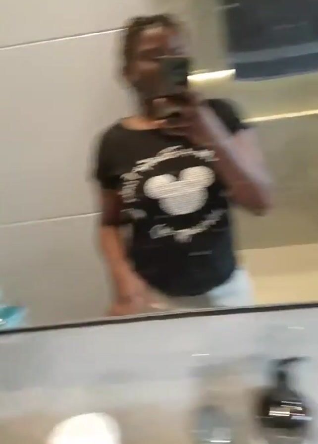 bathroom. A person is standing in front of the mirror, taking a video of themselves. The person is wearing a black t-shirt with a white Mickey Mouse design. They have their hair in braids. The bathroom has light gray marble walls. The video then pans to the toilet, then to a shower. The shower has a glass enclosure and gray marble walls. A gray towel is hanging in the shower.