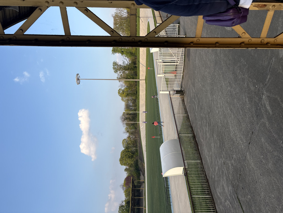 This image depicts an outdoor multi-sport stadium, identified as a facility within Charenton-le-Pont, France. The perspective is from an elevated concrete spectator area, with a yellow metal support beam partially framing the right side of the view. A person's right side, wearing a dark blue jacket and carrying a purple shoulder bag, is visible on the extreme right, adjacent to the support beam. The foreground consists of a cracked concrete surface. A white metal fence with vertical bars separates this area from a lower concrete perimeter walkway. A black cylindrical trash receptacle is situated near this fence. On the lower walkway, a white, arched team shelter is present. Beyond the walkway is a blue running track, which encircles a central green artificial turf sports field. Two individuals are on the blue running track: one adult female, dressed in an orange top and blue trousers, stands near the center of the track facing left; and a small child, wearing a light-colored hooded jacket, is positioned further right on the track, facing towards the field. Red flag markers are visible on the perimeter of the green field. Two sets of white rugby goalposts are prominently located on the far side of the field. A white concrete velodrome track surrounds the entire inner sports area, beyond the running track. In the background, a structure resembling a covered grandstand is partially visible on the far left, positioned behind the velodrome track and partially obscured by trees. A dense line of trees forms the backdrop across the horizon. A tall, slender metal floodlight pole, topped with multiple luminaires, stands on the right side of the field, extending high into the sky. The sky is clear and blue, containing one distinct, elongated white cloud near the center of the frame. The lighting indicates daytime conditions.