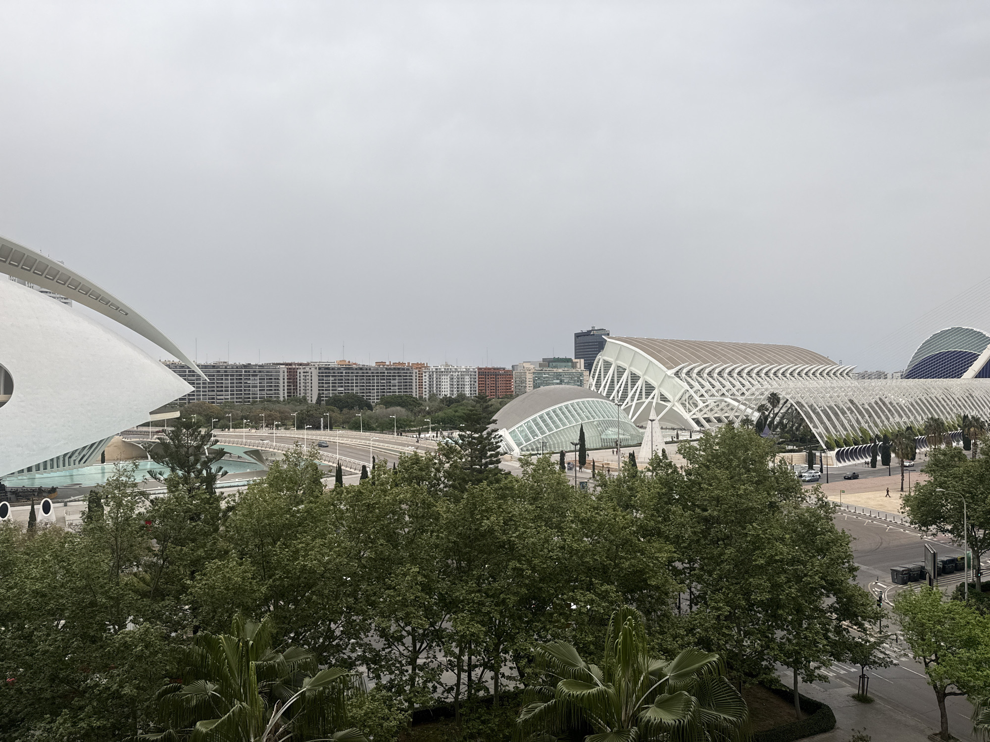 The image captures a cityscape in Valencia, Spain, under an overcast sky. Prominently featured are modern architectural structures of the City of Arts and Sciences, including the Museu de les Ciències Príncipe Felipe (science museum), L'Hemisfèric (IMAX cinema and planetarium), and part of the Palau de les Arts Reina Sofía (opera house). A bridge spans a water feature. In the foreground, trees and palm trees provide a natural contrast to the urban setting. Roads and sidewalks are visible, along with some street furniture. In the distance, buildings are arrayed along the horizon.