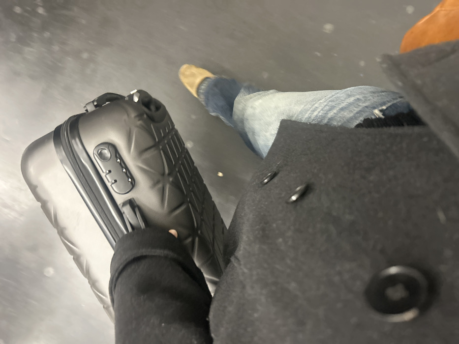 A top-down photograph depicts an individual in motion, observed from the chest downwards. The individual wears a dark, likely black, double-breasted coat with two visible dark buttons on the lapel area, light blue distressed denim jeans, and a tan-colored low-cut shoe on the right foot. The individual's right hand, clad in a dark sleeve, grips the handle of a dark grey, hard-shell rolling suitcase. The suitcase features a textured, geometric pattern on its surface, a black perimeter zipper, and an integrated three-digit combination lock near the handle. The floor is a uniform dark surface, exhibiting minor light-colored debris and slight motion blur, indicative of an active environment such as an airport concourse or a transportation hub within the city of Unknown, Unknown.