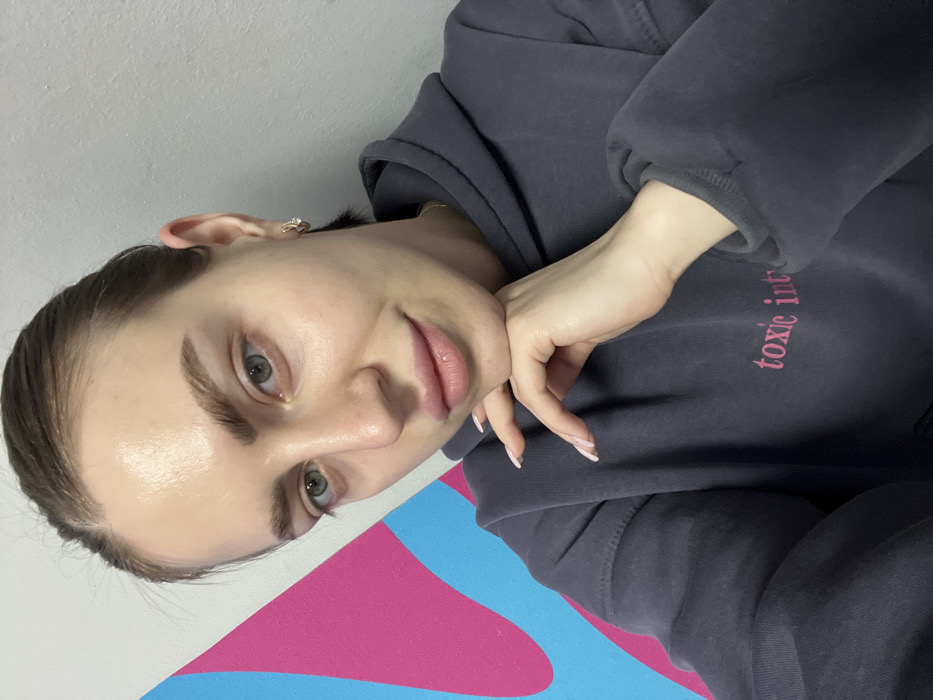 The scene is an indoor setting, with the stated location being Rostov-on-Don, Russia. The image presents a close-up, chest-up view of a single young adult female. She has fair skin, light green eyes, and her brown hair is pulled back. She wears a dark grey hooded sweatshirt with pink text, partially visible as 'toxic int', printed on the chest. A small gold-toned hoop earring with a clear stone is visible on her right ear. Her right hand, featuring light-colored manicured nails, is resting with her chin placed upon it. The background consists of a light grey wall adorned with an abstract graphic design, incorporating curved shapes in vibrant pink and blue on the left side of the frame.