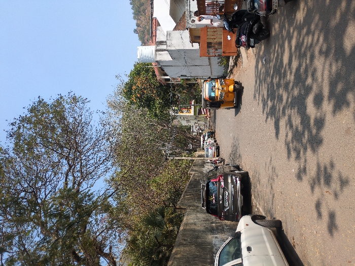 The image displays a sunlit street scene in Tiruvannamalai, India