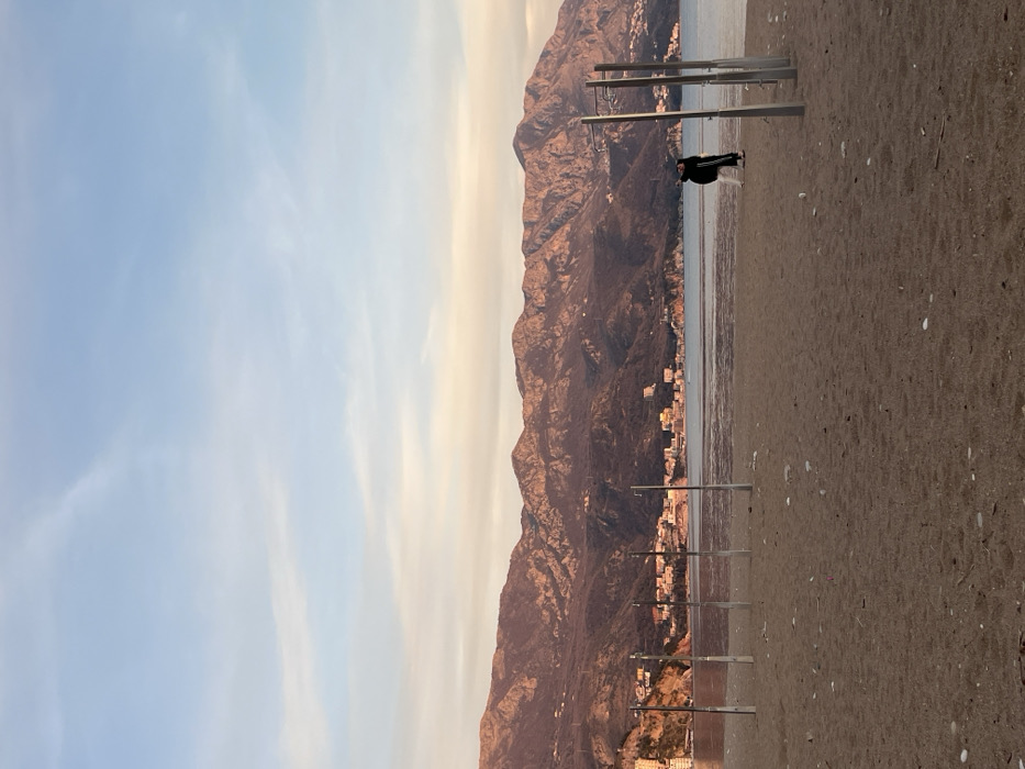 The scene depicts a wide view of a sandy beach in Boreti, Montenegro, during the golden hour. The foreground features light brown sand with scattered small debris. Multiple vertical metal poles are installed in the sand; four single poles are visible on the left side, and a cluster of three poles, identifiable as beach showers, stands on the right. In the midground, near the cluster of showers, two individuals are present. One person, wearing a dark top and light pants, stands facing towards the water and mountains, with their left arm extended, pointing horizontally to the left. The second person, mostly obscured by the first, is also dressed in dark attire and stands in close proximity. The midground transitions to calm, greyish-blue water. The background is dominated by a rugged mountain range, illuminated by warm, reddish-brown sunlight. Along the base of the mountains, bordering the water, is a coastal settlement with numerous buildings. The sky above is a gradient of light blue, transitioning to a soft orange-pink hue near the horizon, with sparse, wispy clouds.