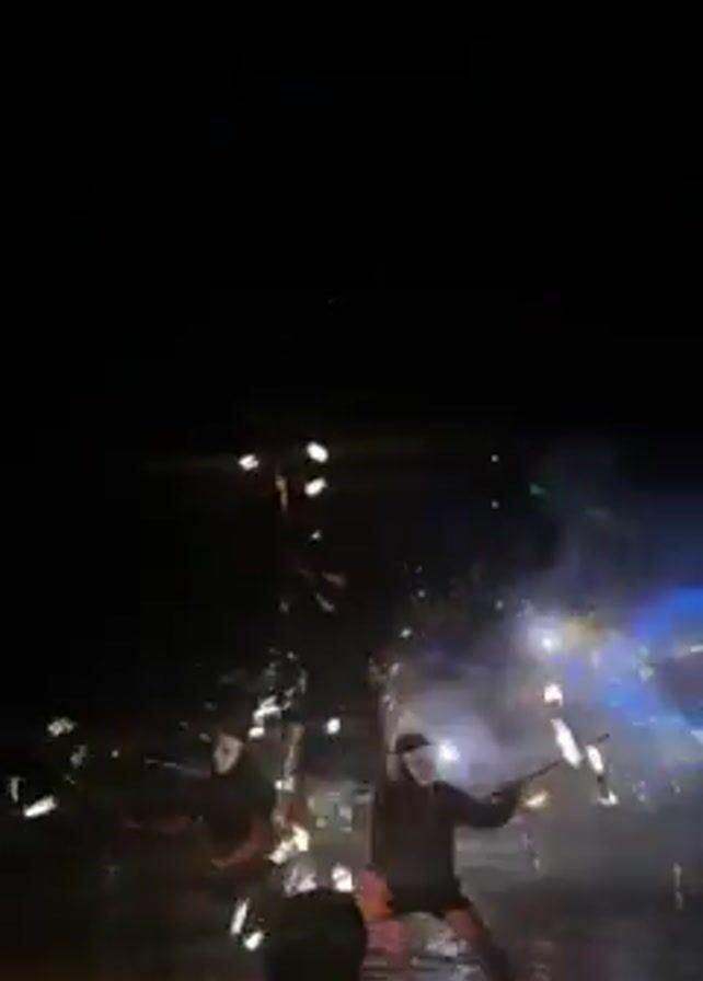 two people wearing white masks standing on a surface near a body of water, possibly a beach, at night. They are performing with burning torches or staffs, creating a display of sparks and light. Behind them, fireworks are going off, illuminating the scene with flashes of color. A person is recording from a low angle. The overall atmosphere suggests a celebration or performance with fire and light effects.