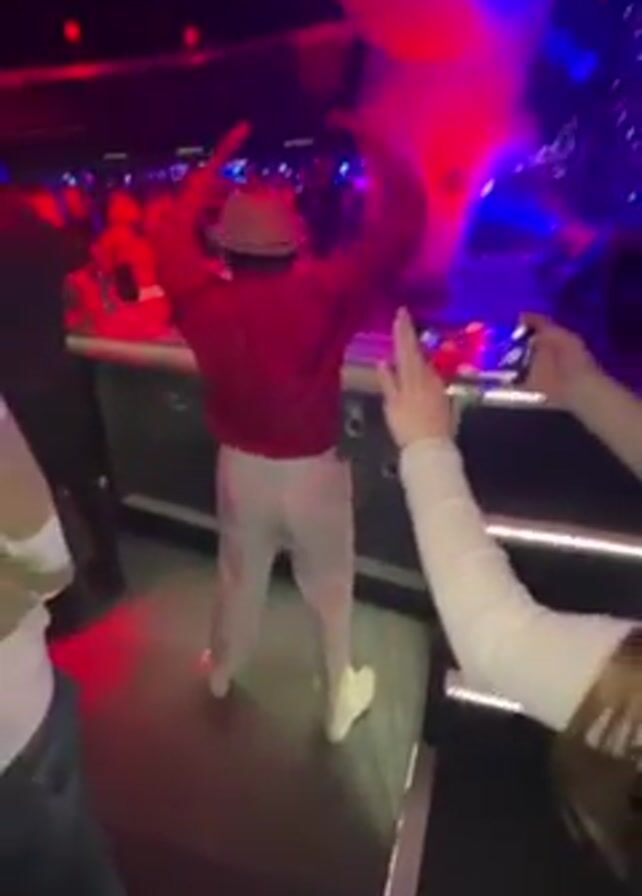 The video takes place inside a crowded nightclub. A man wearing a red jacket, light pants, a beige hat, and white sneakers is seen dancing in front of a bar. He waves a large white balloon or cloth in the air. Other people stand nearby, some with their hands raised in the air. The club is lit with red and blue lights and a disco ball hangs from the ceiling. Some people are standing and others are moving through the crowd.