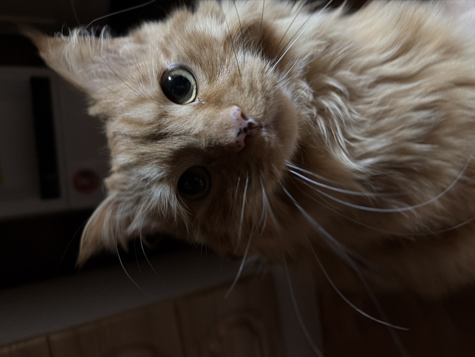 A close-up, slightly tilted, photograph of an orange cat’s face. The cat has large, round eyes with black pupils and is angled downward, peering at the viewer. The cat's whiskers are long and white, extending outward. The cat has small, dark freckles on its nose. The background is dark, with an appliance visible in the upper left corner. The lighting is dim and focused on the cat's face.