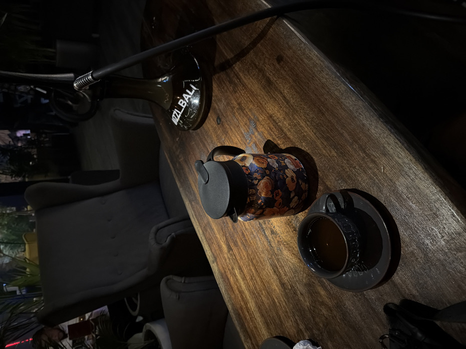 A wood-grain table setting features a cup of coffee on a saucer, a floral-patterned teapot, and a hookah with the brand "BIZZLBALL" visible