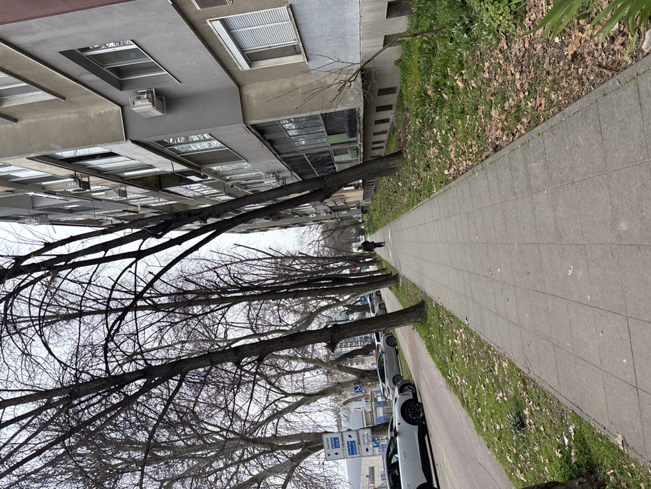 The image captures an urban street scene in Plovdiv, Bulgaria, on an overcast day. A long, straight sidewalk constructed of grey square concrete slabs extends from the foreground toward the vanishing point. The sidewalk is flanked by bare deciduous trees with dark branches. To the left of the sidewalk, a grassy strip separates it from a paved street. Several vehicles are parked parallel to the curb on this street, including a white SUV with black accents and a grey sedan. A blue directional sign, located on the left, displays white text in Bulgarian, indicating "МЕРУДИЯ" (MERUDIYA), "СПОРТНА ЗАЛА" (Sports Hall), "ЦЕНТЪР" (Center), and "СЪРБИЯ" (Serbia), along with a blue circular bicycle sign. To the right of the sidewalk, a narrow strip of ground with sparse grass and fallen leaves borders a multi-story building. This building features a grey and beige facade, multiple windows—some with external roller shutters—and numerous external air conditioning units mounted on its exterior walls. A single individual, dressed in a dark coat, is walking away from the camera on the sidewalk in the middle distance.