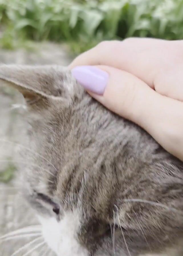 A hand with light purple nail polish is petting a gray and white cat. The cat is standing on a gray stone surface with some greenery visible in the background. The cat's eyes are mostly closed as it is being petted.