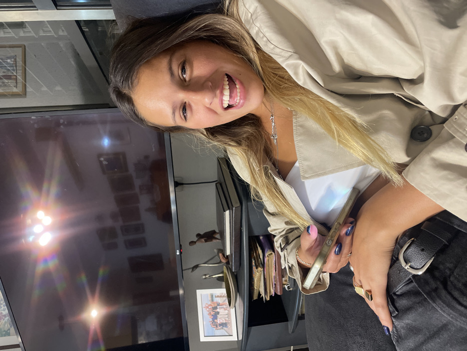 A young adult female, appearing in her 20s, is seated indoors, likely in a private residence in the city of Unknown, Unknown. She has long, straight, light brown hair and is smiling widely with her mouth open, revealing her teeth. She wears an open, light-colored (beige) trench coat over a white top, with a silver-colored necklace visible. Her left hand holds a light-colored smartphone; her fingernails are painted dark blue/purple, with some featuring a pink accent on the tip. A gold-colored ring with a black square inlay is visible on her right ring finger, and her right hand rests on her lap. She wears dark-colored pants with a black belt and a silver buckle. Behind her, a large, dark flat-screen television is mounted, reflecting internal room lights, lens flares, and multiple framed pictures on a wall. Below the television, a dark-colored media console displays a white-framed photograph of a group of people, a dark oblong dish, two metallic abstract sculptures, a small dark figurine of a person, and a stack of two dark-bound books. On a lower shelf of the console, several older notebooks are stacked. To the right of the television, a window with horizontal blinds is partially visible. The scene depicts a casual indoor setting.