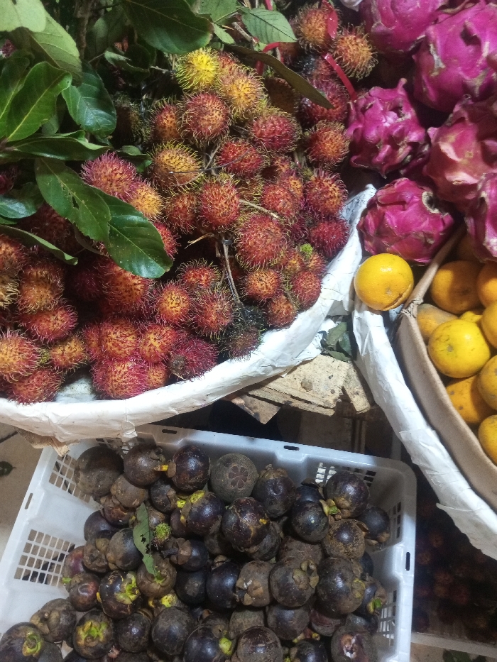 This image depicts a fruit display at a market stall in Cipanas, Indonesia