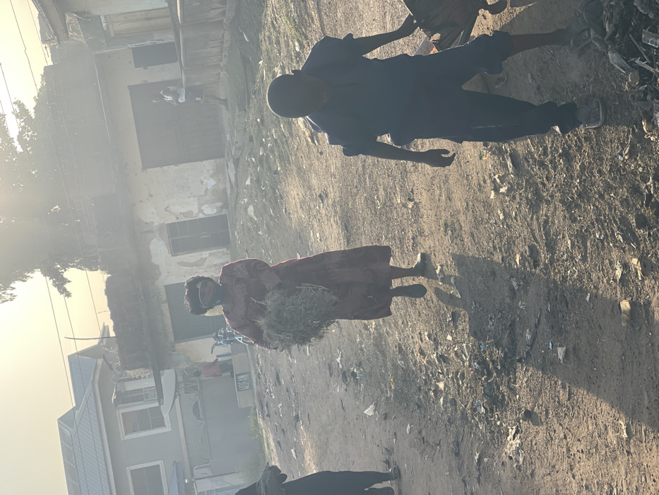 A woman in a red dress carries a bundle of green foliage in a dirt lot. A child in a blue shirt stands nearby. The ground is littered with debris. In the background, rundown buildings stand alongside newer constructions. Bright sunlight casts long shadows, suggesting early morning or late afternoon. The scene depicts an impoverished area with a mix of old and new infrastructure.