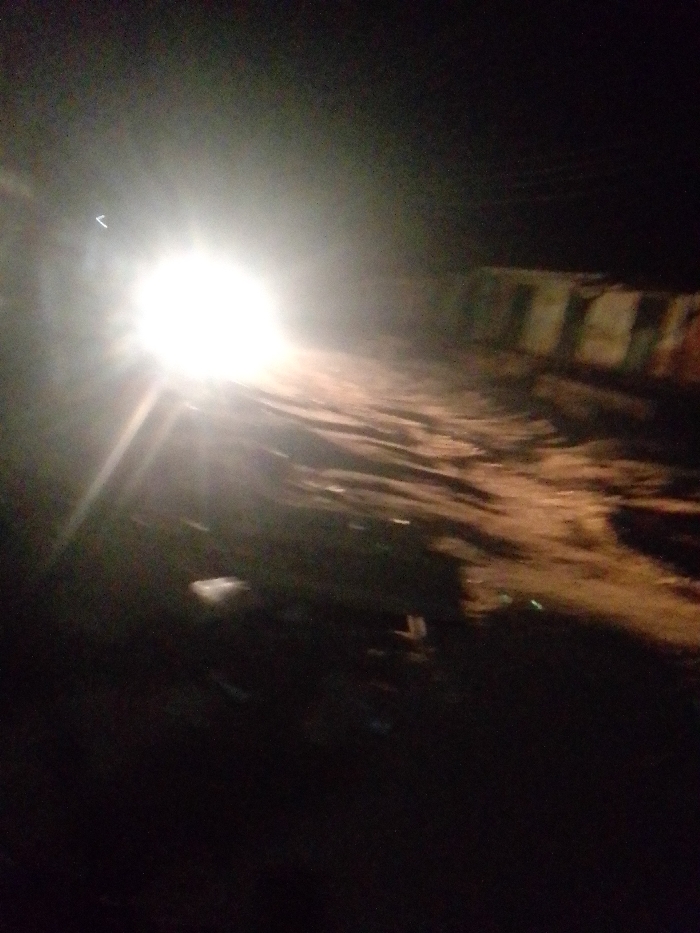 The photo depicts a dark and desolate scene at night. A bright light source dominates the left side of the frame, likely a car headlight or streetlight, illuminating a rough, uneven road surface. Shadows and darker areas surround the light, suggesting a lack of ambient illumination. On the right, a dilapidated structure or building is partially visible, adding to the sense of decay and abandonment. The overall atmosphere is somber and possibly unsettling.