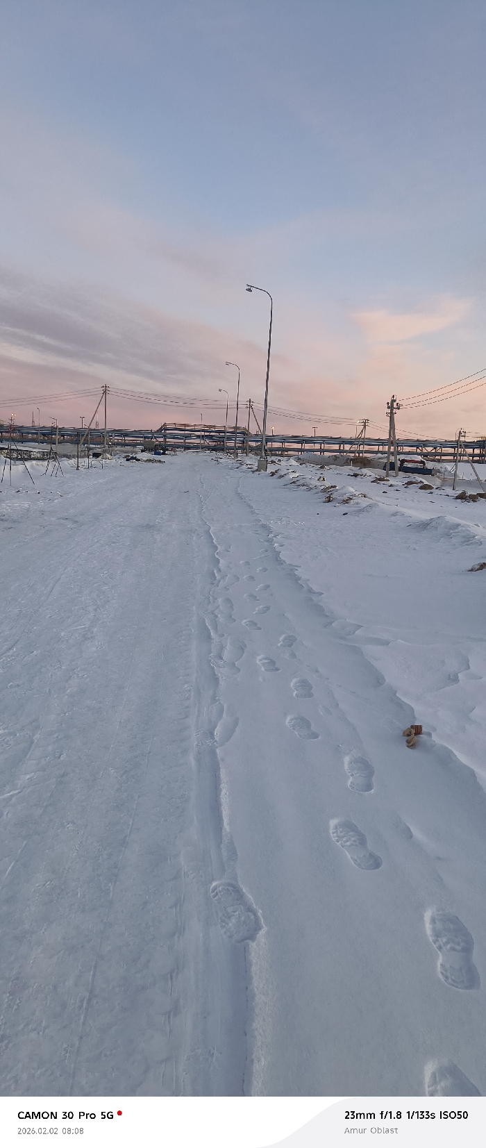 A snowy landscape under a pastel sky with pink and blue hues. The ground is covered in white snow, marked by tire tracks and footprints leading towards a distant elevated structure with pipes and utility poles. A single, tattered object lies on the snow surface. The image's bottom corners show camera information, including model, date, and photographic settings.