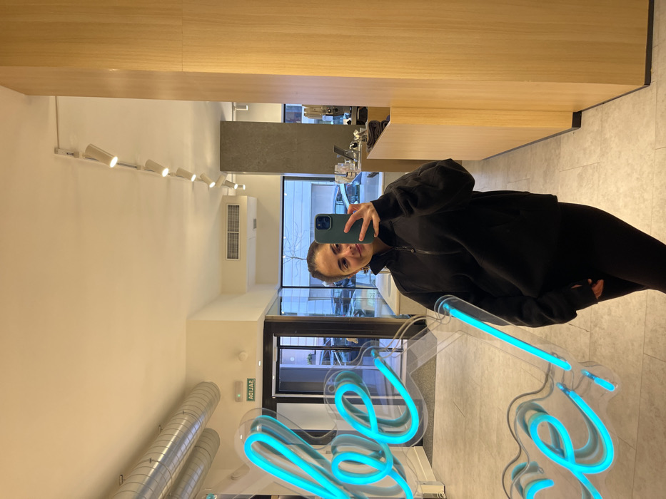 The image depicts a female individual taking a mirror selfie inside a modern commercial establishment in Madrid, Spain