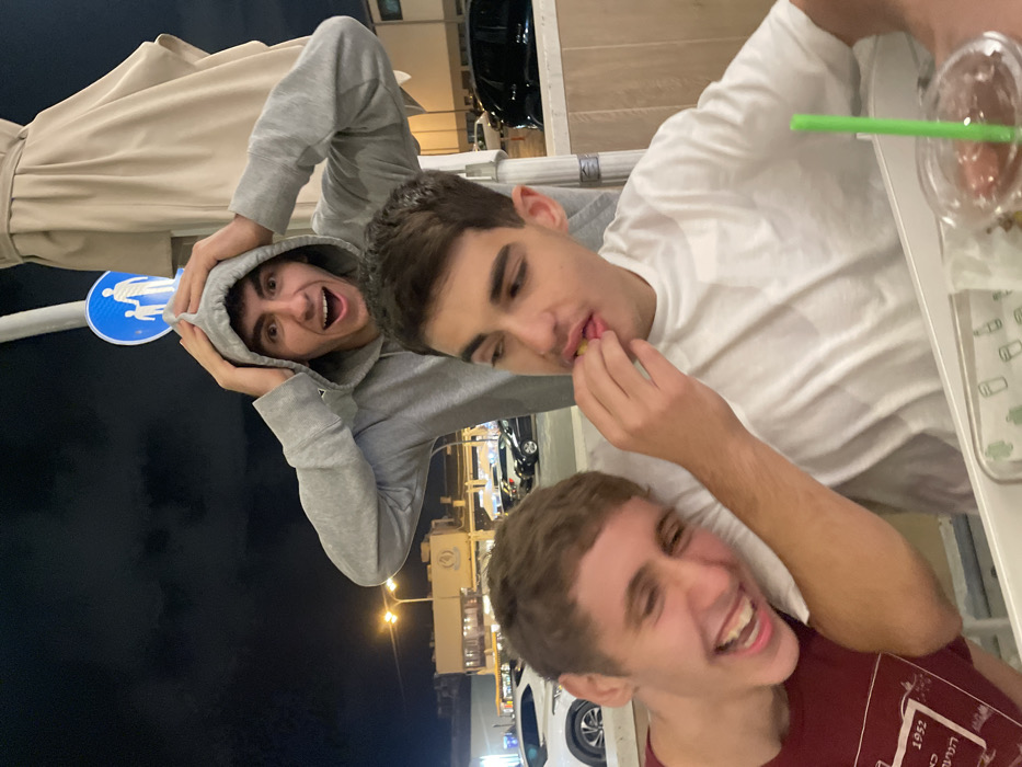 An outdoor nighttime scene depicts three young males in an urban setting of an unknown city, likely at a restaurant's patio area. In the foreground, two males are seated at a white table. The male on the left, with light brown hair, wears a maroon short-sleeved shirt with white text and is captured mid-laugh, mouth wide open, head tilted to his right. His left arm is extended towards the male next to him. The male in the center-foreground, with dark brown hair, wears a white short-sleeved t-shirt. He is observed consuming a French fry from his right hand, with his head slightly turned to the right. On the table, a clear plastic cup with a dark liquid and a green straw is visible, along with a white paper tray featuring green graphic patterns. Positioned in the background, behind and above the two seated individuals, a third male with dark hair wears a grey hooded sweatshirt, with the hood pulled over his head. His hands are gripping the sides of his hood, and his mouth is open in an exaggerated expression. Behind this individual, a light-colored pole supports a blue circular sign depicting a pedestrian. To the right of the pole, a folded beige outdoor umbrella or canopy is visible. The distant background shows multiple yellow-lit streetlights, illuminated building facades, and several parked vehicles, including a white SUV and a dark sedan, under a dark night sky.