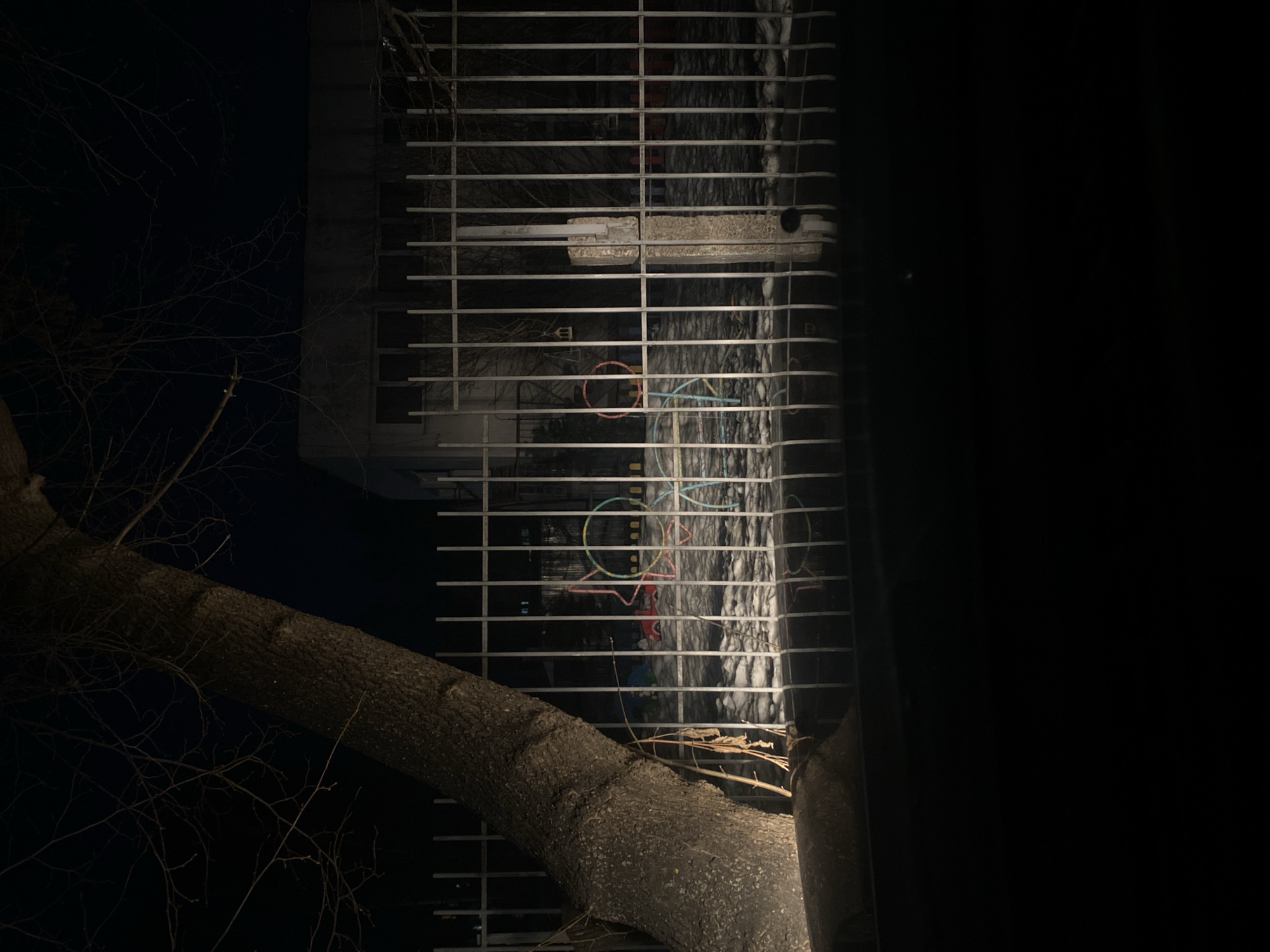 The image, taken at night, shows a metal grate in front of a light-colored building. A tree branch extends from the left, partially obscuring the grate. Behind the grate and the branch, there is what appears to be a tree trunk and some other vegetation. Colorful wires and a red object are visible behind the grate. The right side of the image is mostly darkness. The location is Chaikovsky, Russia.