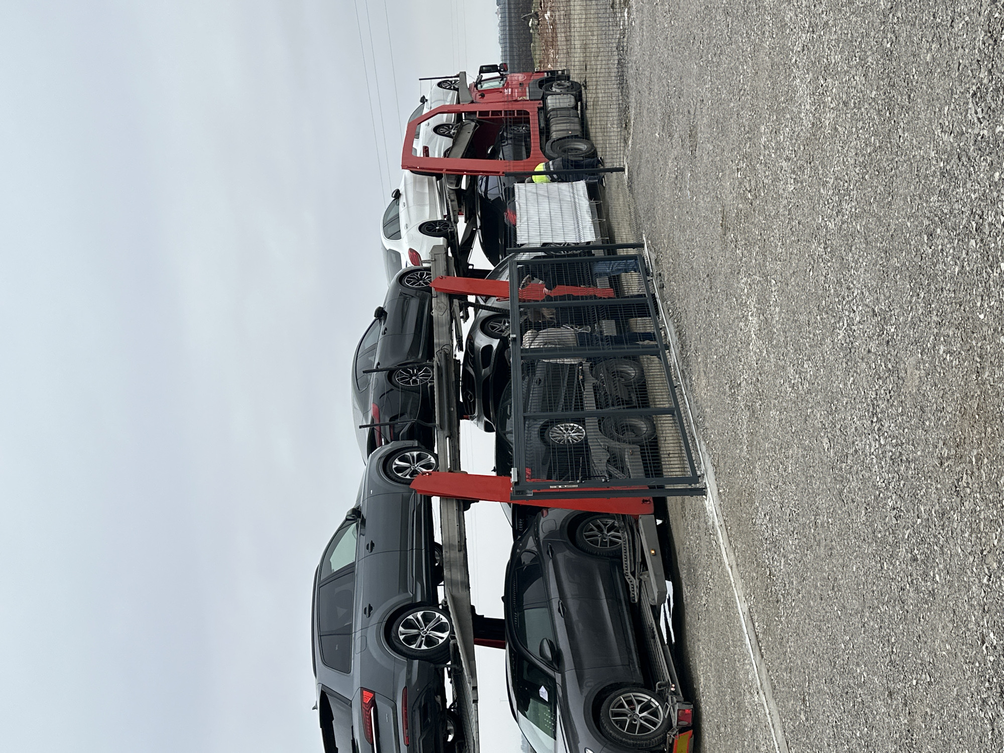 A car carrier truck, loaded with multiple vehicles, is parked on an asphalt surface