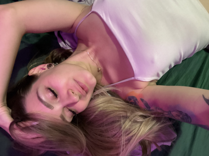 A woman reclines on a green surface, possibly a bed. She wears a thin white top with delicate straps. Her fair skin is illuminated by a soft, pinkish light, highlighting her closed eyes and subtle smile. One hand rests behind her head, while the other arm extends out of the frame, revealing a detailed tattoo. Her blonde hair is partially out of focus, adding a sense of relaxed intimacy.