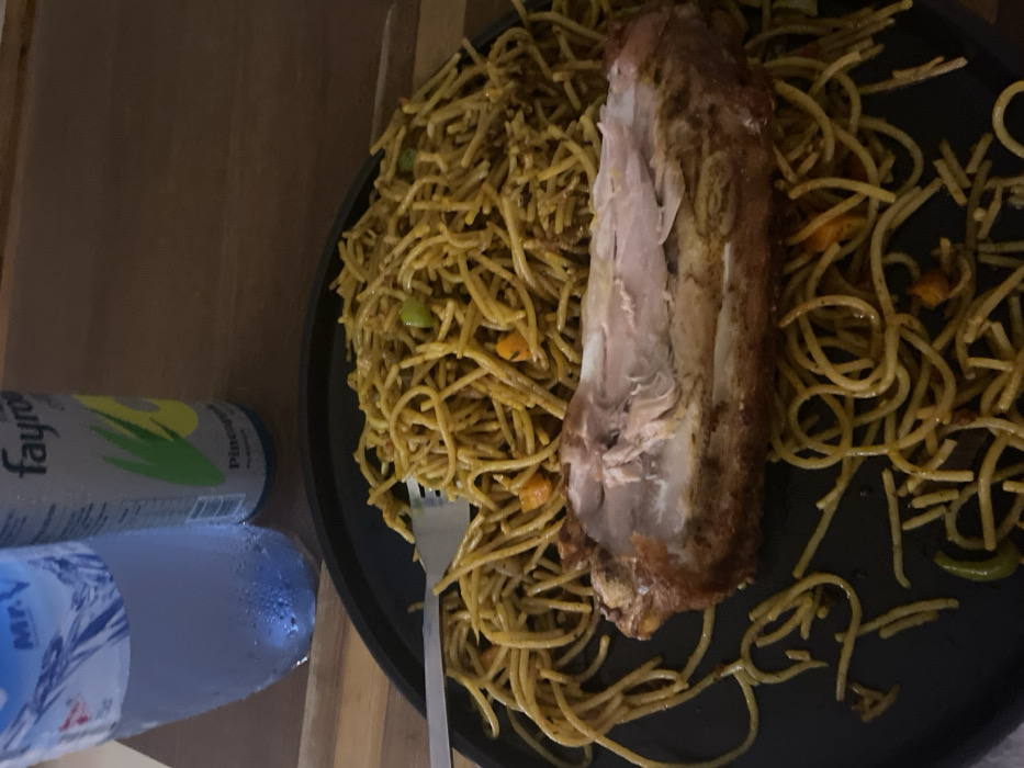 A meal is depicted indoors on a wooden surface in Ajara, Nigeria. A black circular plate occupies the foreground, holding a large serving of seasoned spaghetti mixed with diced orange and green vegetables. Positioned across the center of the spaghetti is a substantial piece of roasted or fried poultry, partially eaten or cut open, revealing its white meat and bone structure. A silver fork rests on the left side of the spaghetti. In the background, behind the plate, are two beverages: a clear plastic bottle of "Mr. V" brand water, exhibiting condensation, and a grey aluminum can of "Fayrouz Pineapple Flavour" carbonated drink. The lighting is ambient. No individuals are visible.