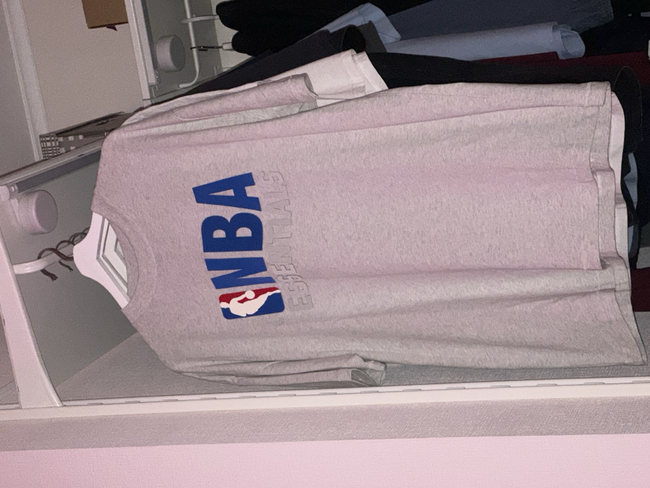 The scene depicts the interior of a wardrobe or closet, presumably located in Vsevolozhsk, Russia. A light grey, short-sleeved t-shirt is centrally featured, suspended by a white clothes hanger with a metal hook. The t-shirt displays the "NBA" logo in blue, with the silhouette of a basketball player in red and white. Below this, the word "ESSENTIALS" is subtly embossed or printed in a tone similar to the t-shirt fabric. The t-shirt hangs on a metal rail. To the right, additional garments of varying dark shades are visible, hanging on separate hangers. Above the rail, a white shelf holds a light-colored box. A circular light fixture or sensor is attached to the underside of the shelf or the closet ceiling. The interior walls of the closet appear light-colored. To the far left, a segment of a textured, light pink wall is visible, suggesting the surrounding room. No individuals are present.