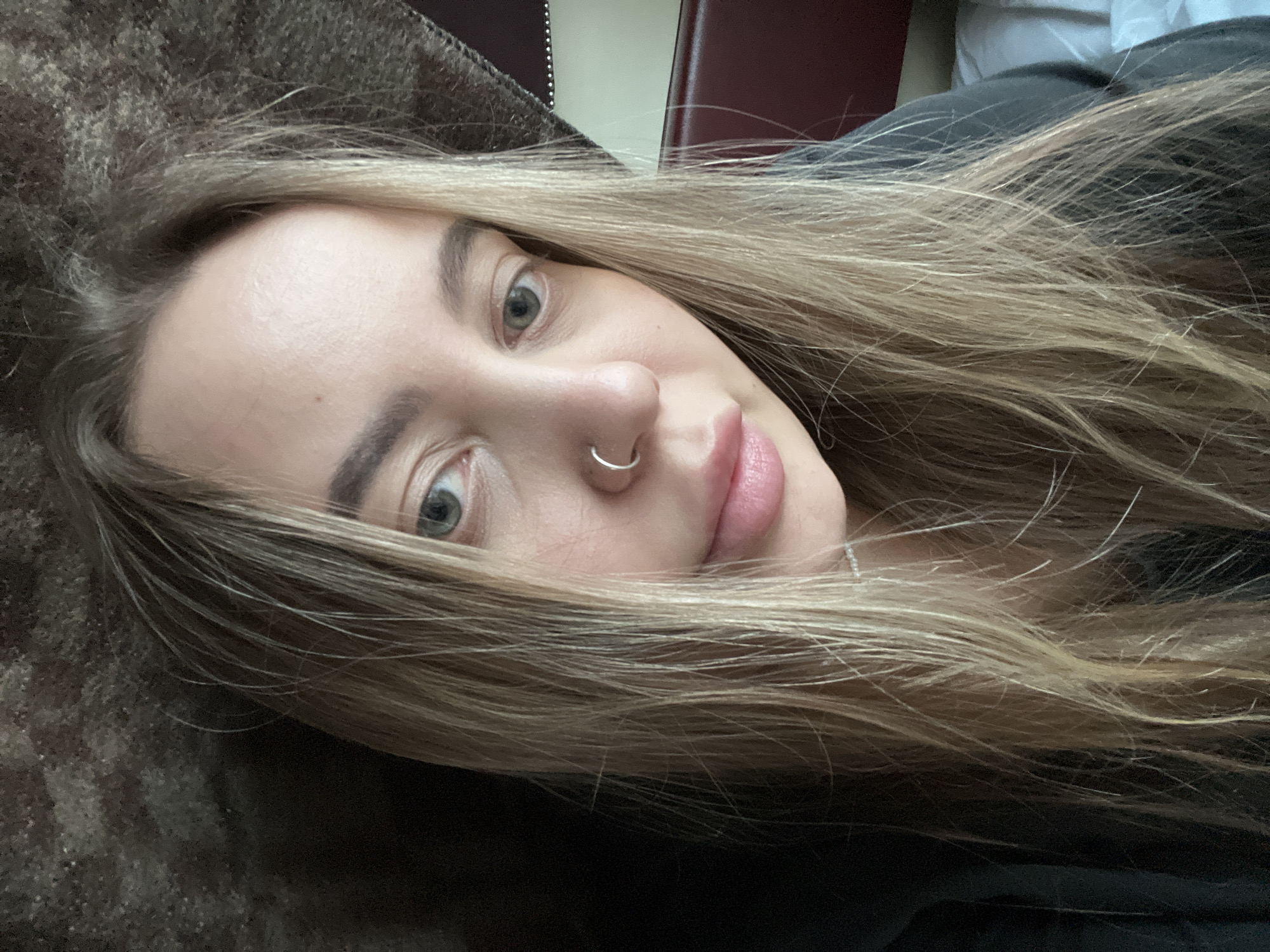 A young woman with blonde hair and a nose ring is lying down